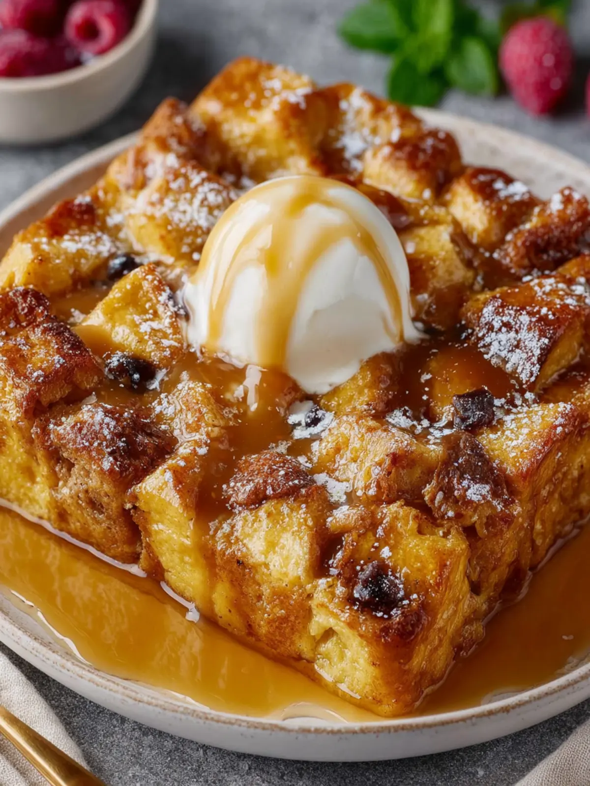 - Pair it with a scoop of vanilla ice cream for contrast. The creamy ice cream beautifully balances the warm, spiced bread pudding.