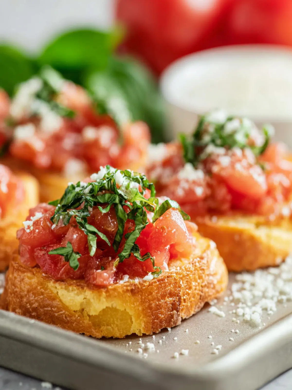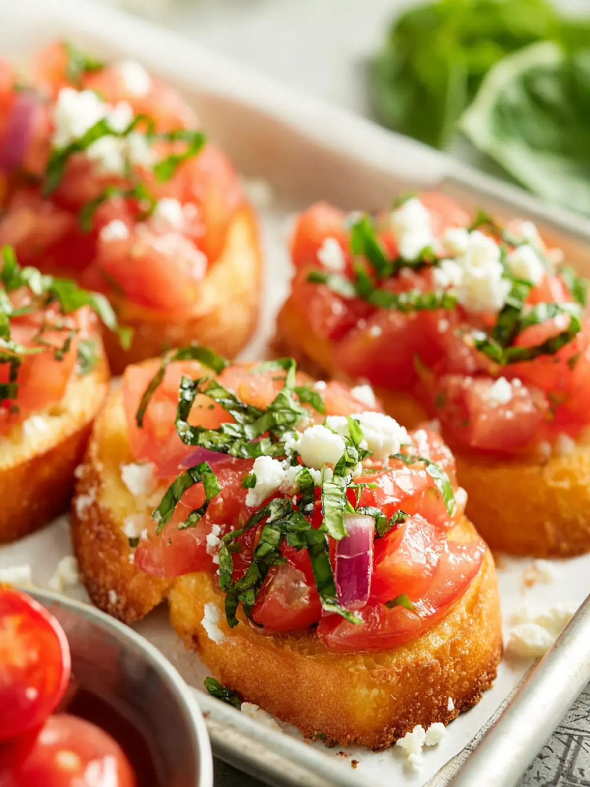 Basil: Fresh basil leaves are the star herb in this dish, providing a fragrant, aromatic quality that elevates your bruschetta.