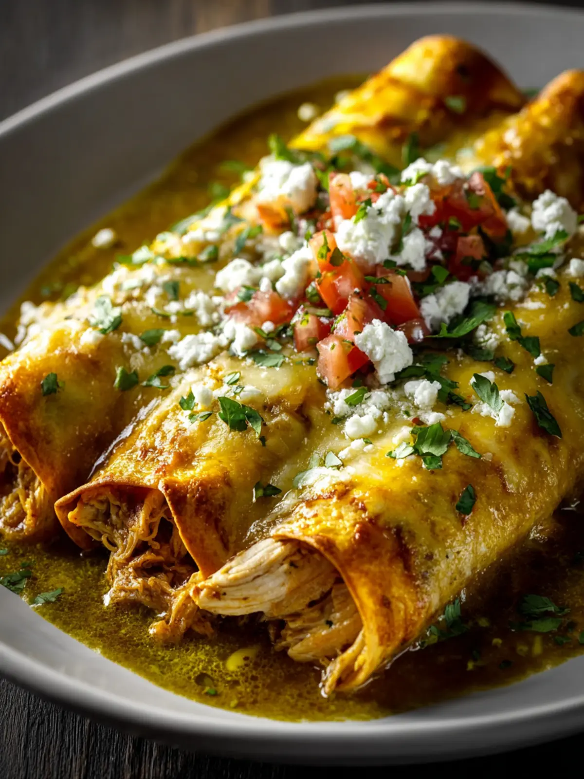 Delicious enchiladas filled with shredded chicken, cheese, and roasted green chiles, topped with a rich green enchilada sauce.