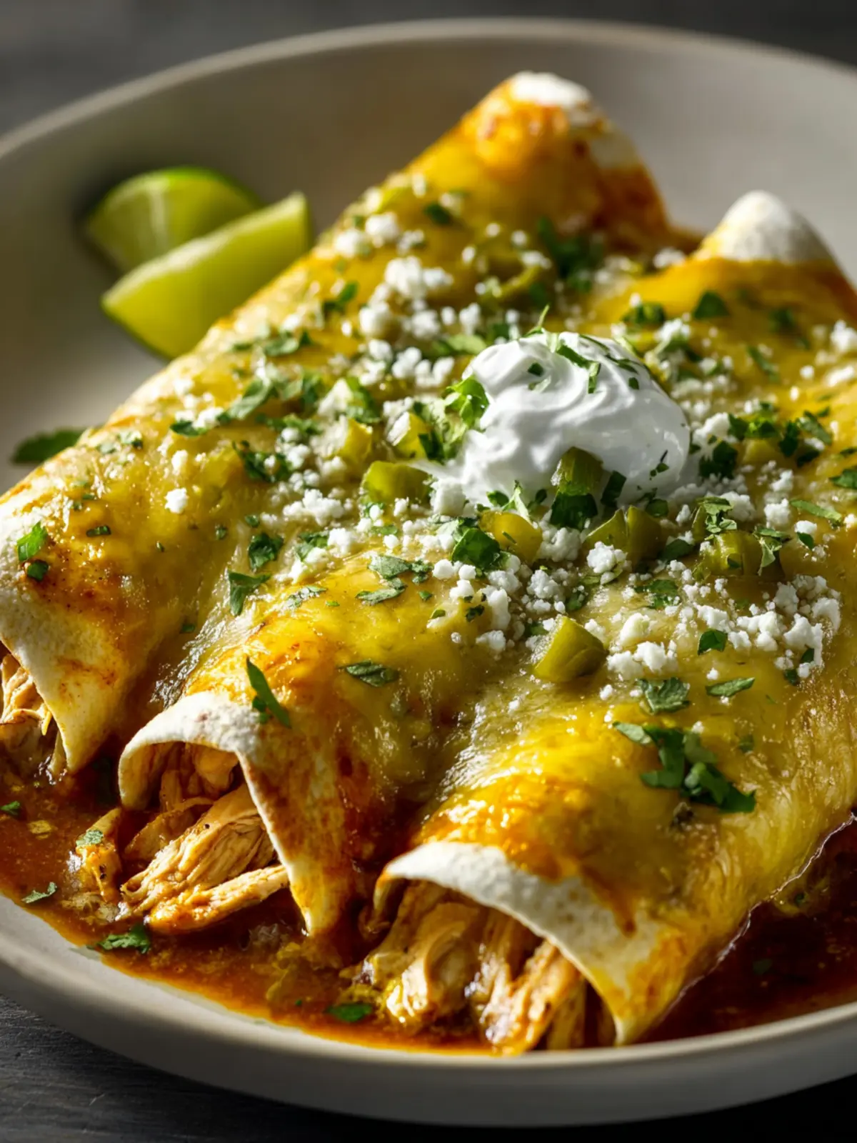 The heart of these chicken enchiladas lies in the succulent shredded chicken, infused with zesty lime juice and aromatic spices. Toss in a blend of cheese that melts beautifully for the perfect gooey texture, making each bite irresistible.