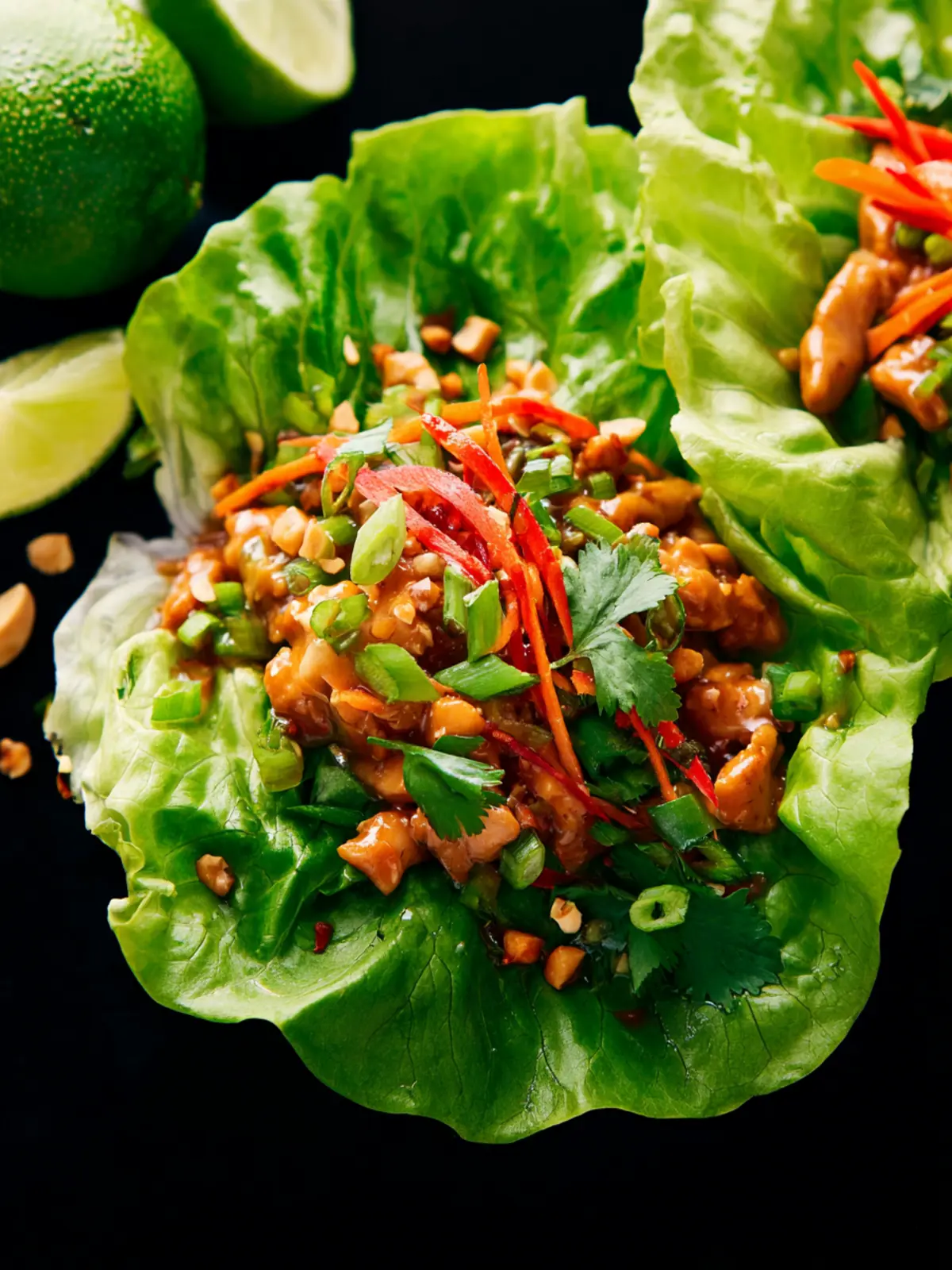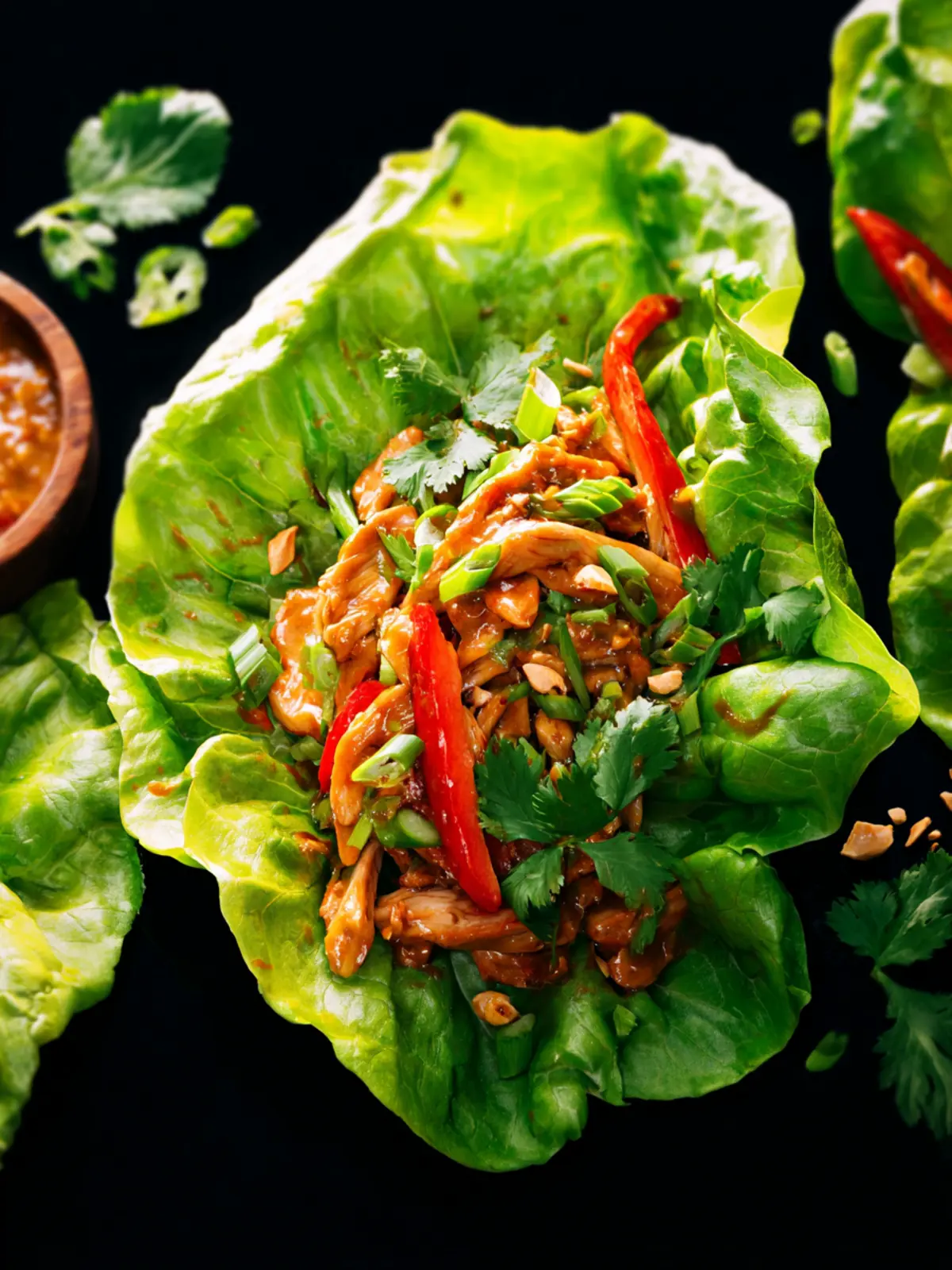 - Assemble: Wash and thoroughly dry the lettuce leaves. Divide the chicken evenly among the 12 leaves, then top with bell pepper, carrots, cucumber, and peanuts. Finish with fresh cilantro, drizzle generously with peanut sauce, and serve right away with lime wedges on the side.