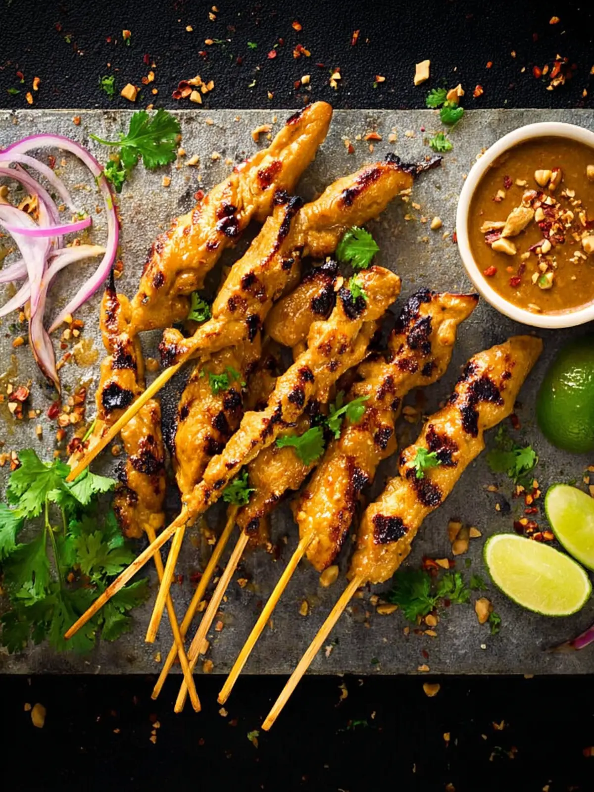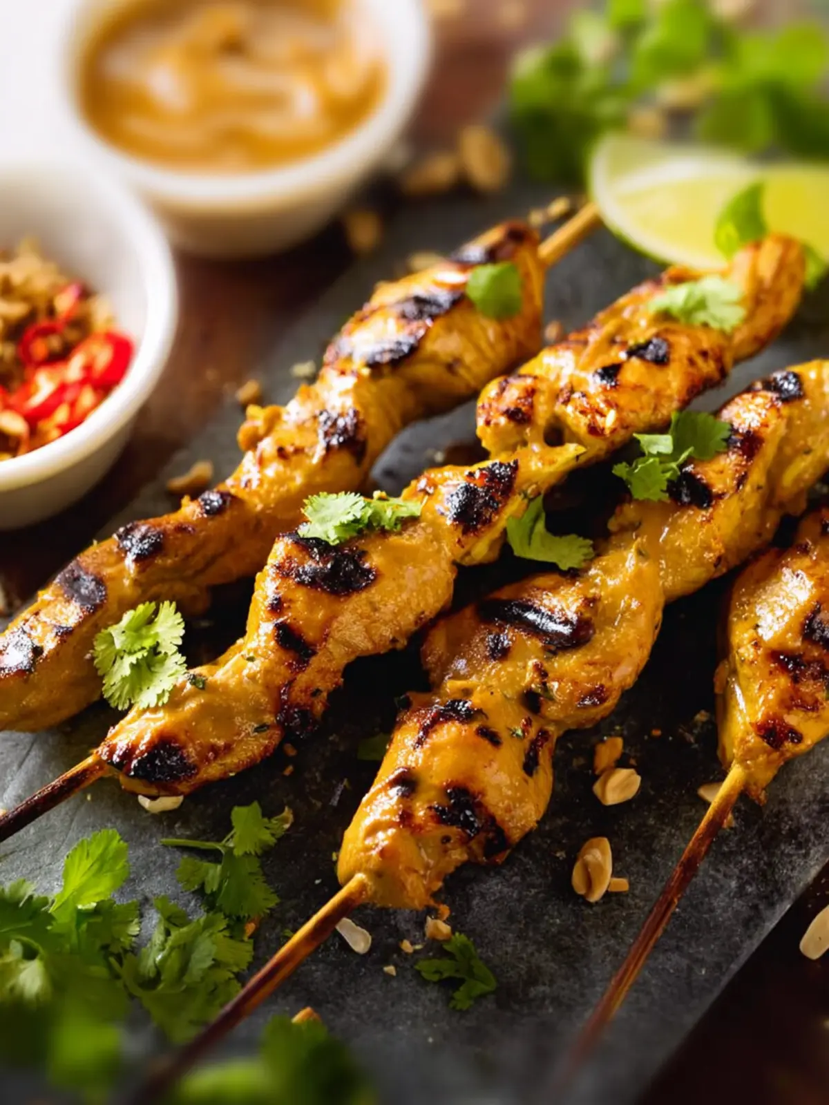 - Grill chicken until cooked through, about 2-3 minutes per side. Let rest for 2-3 minutes. Sprinkle with peanuts and cilantro, then serve warm with peanut sauce and lime wedges.