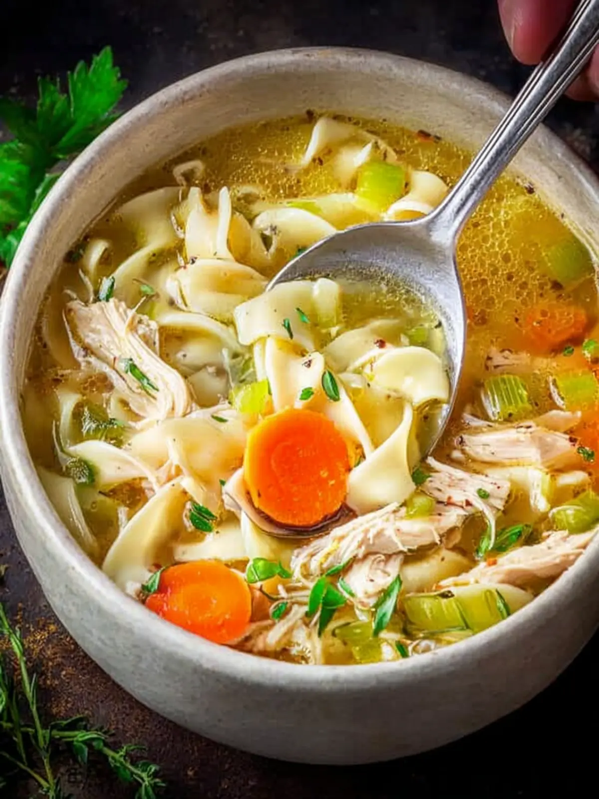 Herbs: Fresh parsley and thyme add an enticing aroma and deepen the flavor profile. Just a sprinkle at the end elevates your easy chicken noodle soup to restaurant-quality!