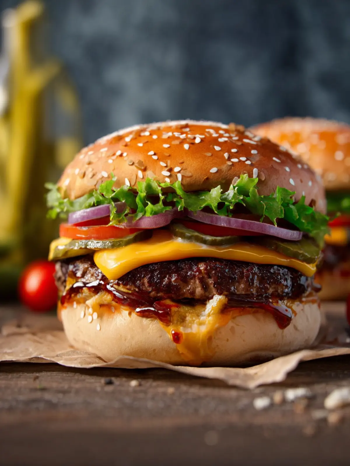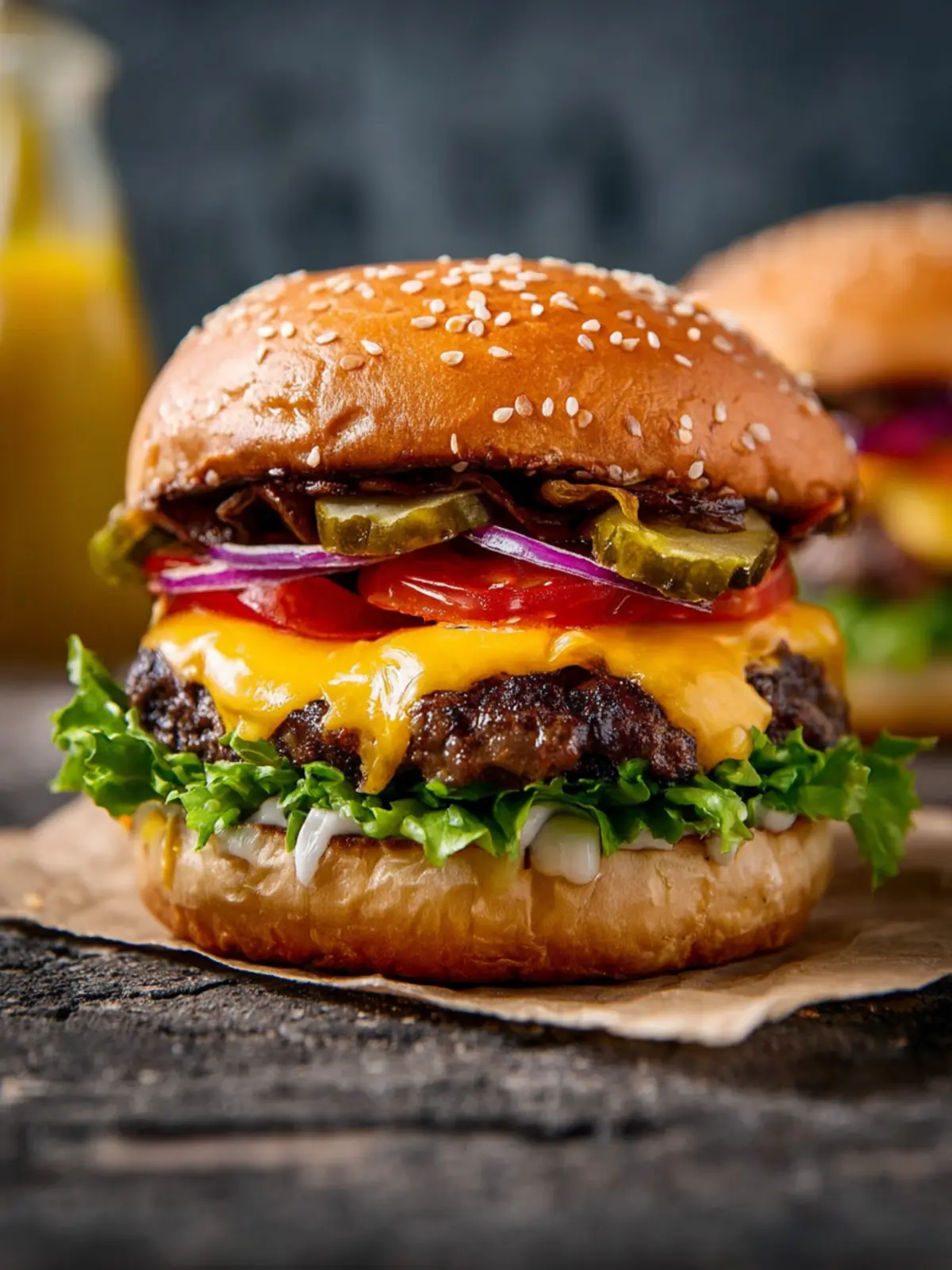 These juicy double cheeseburgers are made with high-fat minced beef, fresh ingredients, and a special burger sauce for an unforgettable meal.