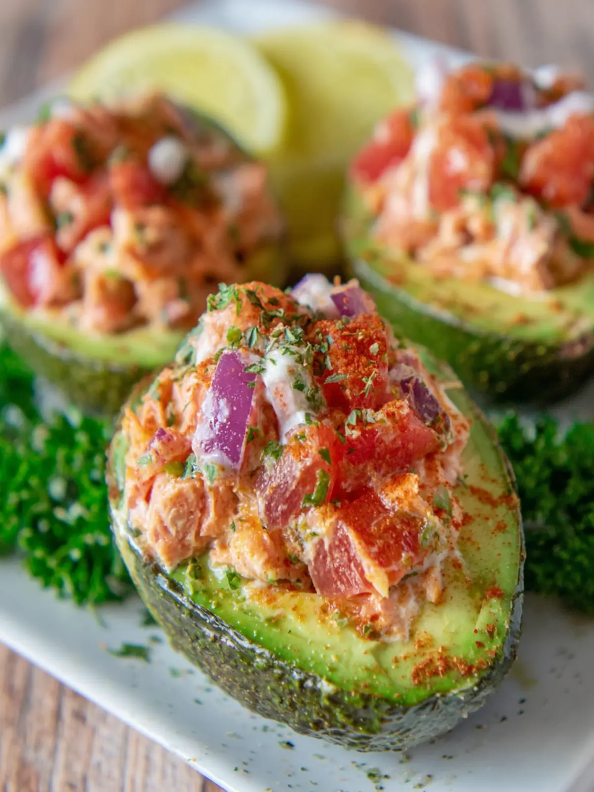 A fresh and healthy stuffed avocado recipe filled with a delicious tuna salad mixture.