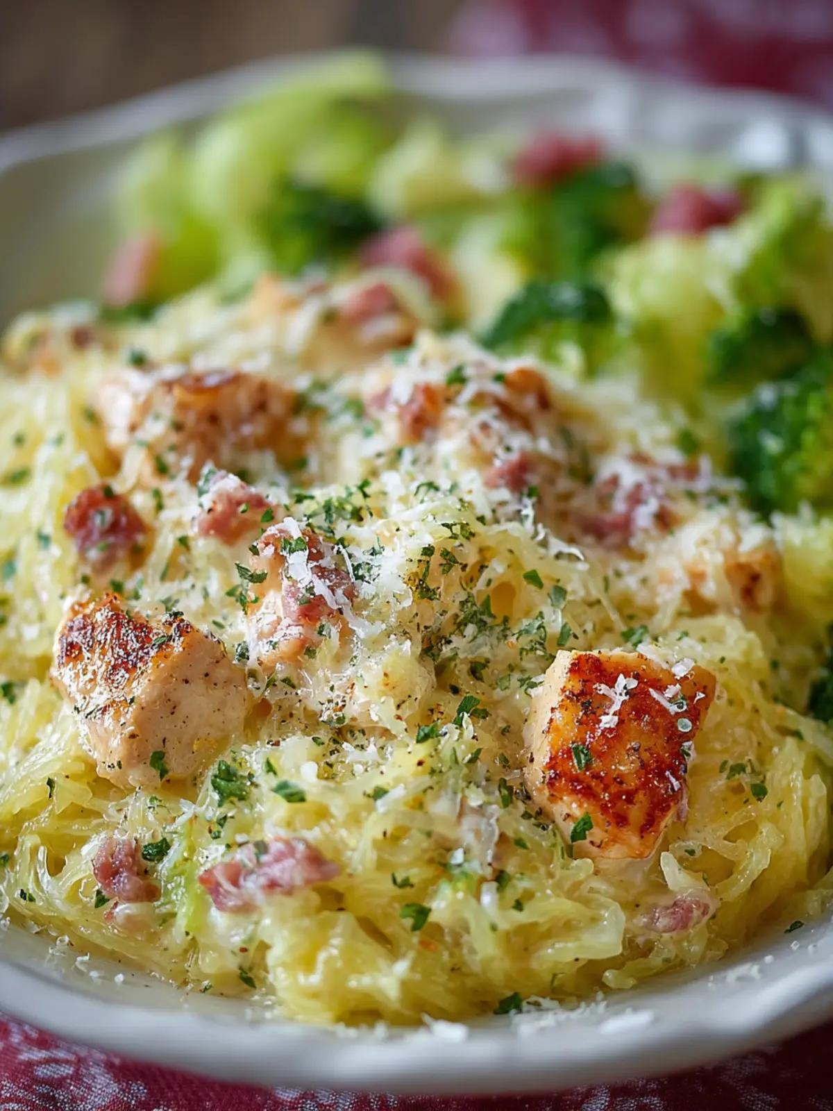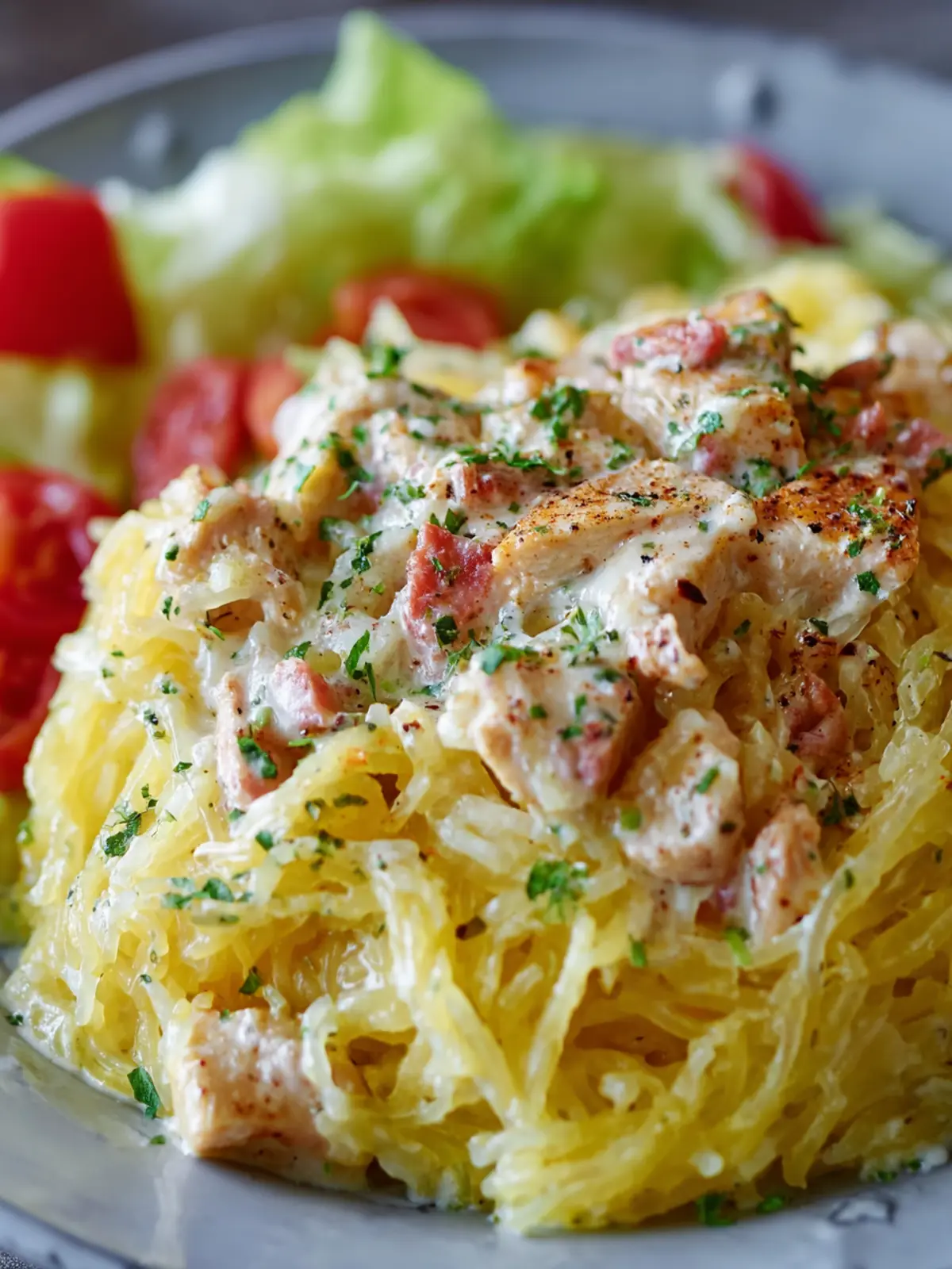 A delicious and creamy spaghetti squash dish with chicken, perfect for a healthy meal.