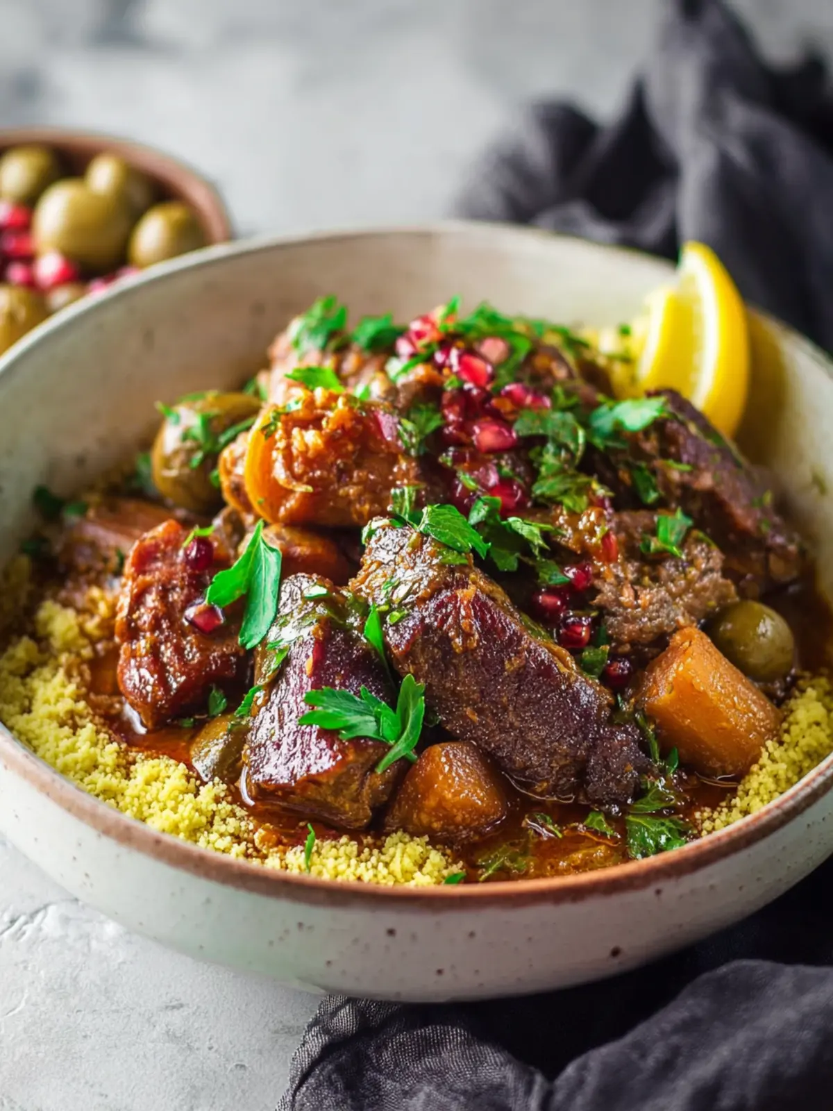 A flavorful lamb tagine slow-cooked with aromatic spices, served over fluffy couscous.