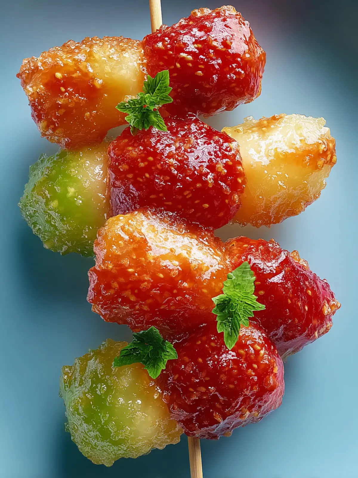 Delicious and sweet fruit skewers coated in a candy syrup.