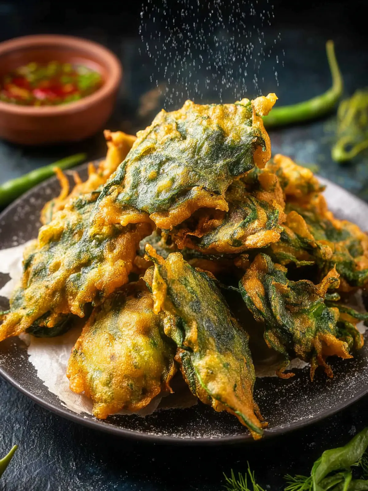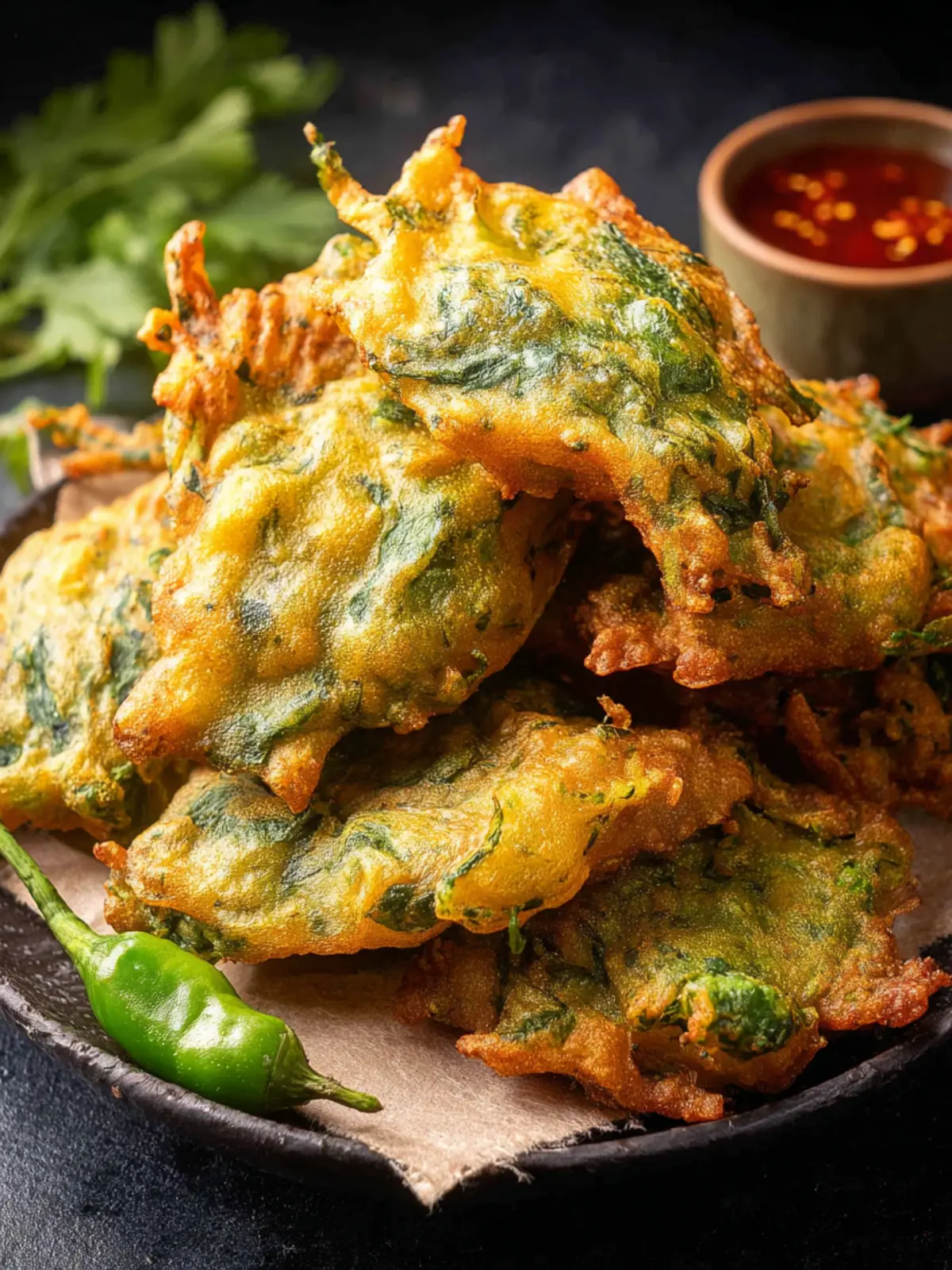 Delicious crispy spinach pakoras, perfect for snacking or as an appetizer.
