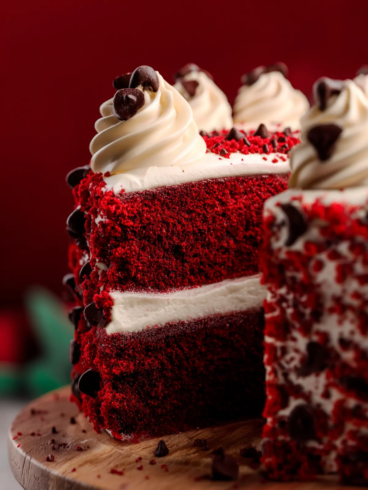 With these thoughtful touches, your red velvet chocolate chip cake will not only taste divine but also look inviting enough to impress any guests!