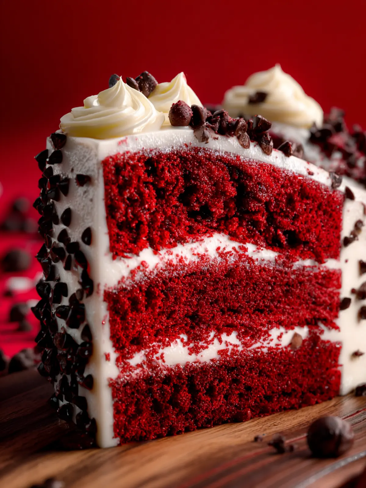 Imagine the symphony of flavors as you take your first bite. The velvety texture of this cake, with its deep crimson hue, is complemented by the rich, semi-sweet chocolate chips scattered throughout. This cake doesn’t just taste good; it looks exquisite, adding a touch of elegance to your dessert table.